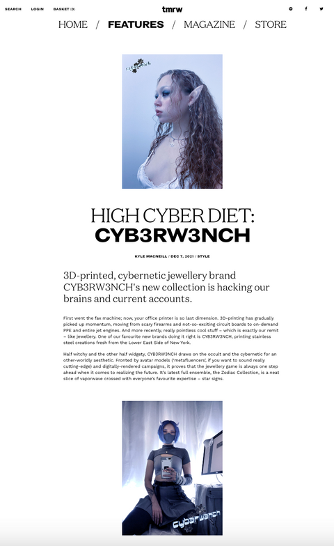 Cyb3rW3nch in TMRW Magazine — 3D printed cybernetic jewelry brand Cyb3rW3nch's new collection is hacking our brains and current accounts